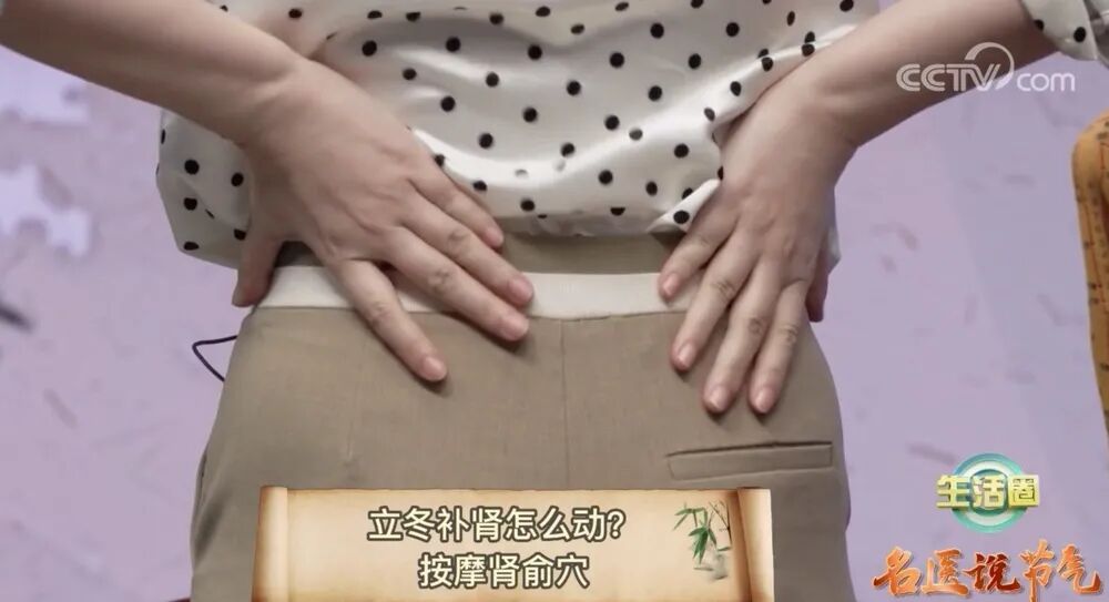 做法:先把两手搓热后,用手心放在肾俞的部位,上下揉搓,搓到腰部发热就可以,每天早晚各搓3分钟左右,能起到温补肾阳的作用,可以缓解肾虚引起的腰膝酸软,耳鸣等症状。