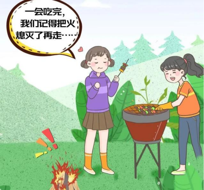 秋游烧烤、野炊时,周边不要有过多的灌木或有茂密的树木。结束后要采用水浇、踩踏等方式彻底熄灭炭火,避免产生阴燃。一旦起火,火借风势,风助火威,衰草满地,容易造成“火烧连营”的惨剧。
