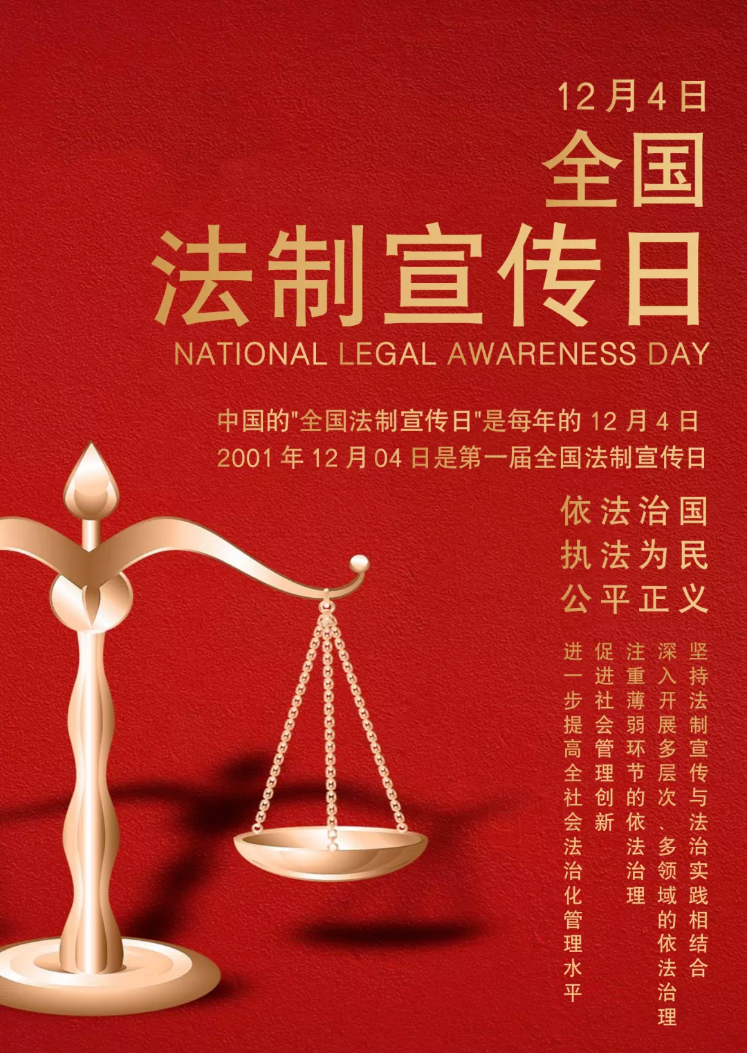 中国的“全国法制宣传日”是每年的12月4日。2001年12月04日是第一届全国法制宣传日。同时也是国家宪法日,国家将通过多种形式开展宪法宣传教育活动。