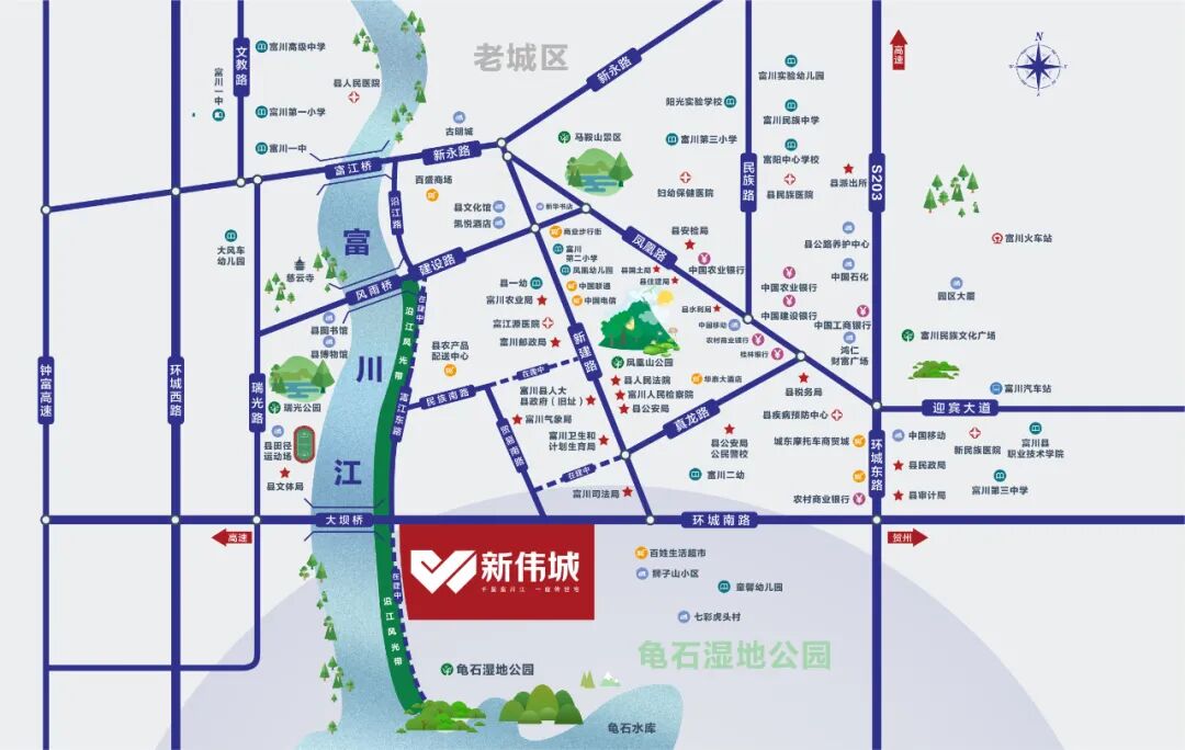 新伟城,位于富川江旁。沿江的风景,一览无余,同时,紧靠龟石湿地公园,畅享富江第一排,与自然0距离。